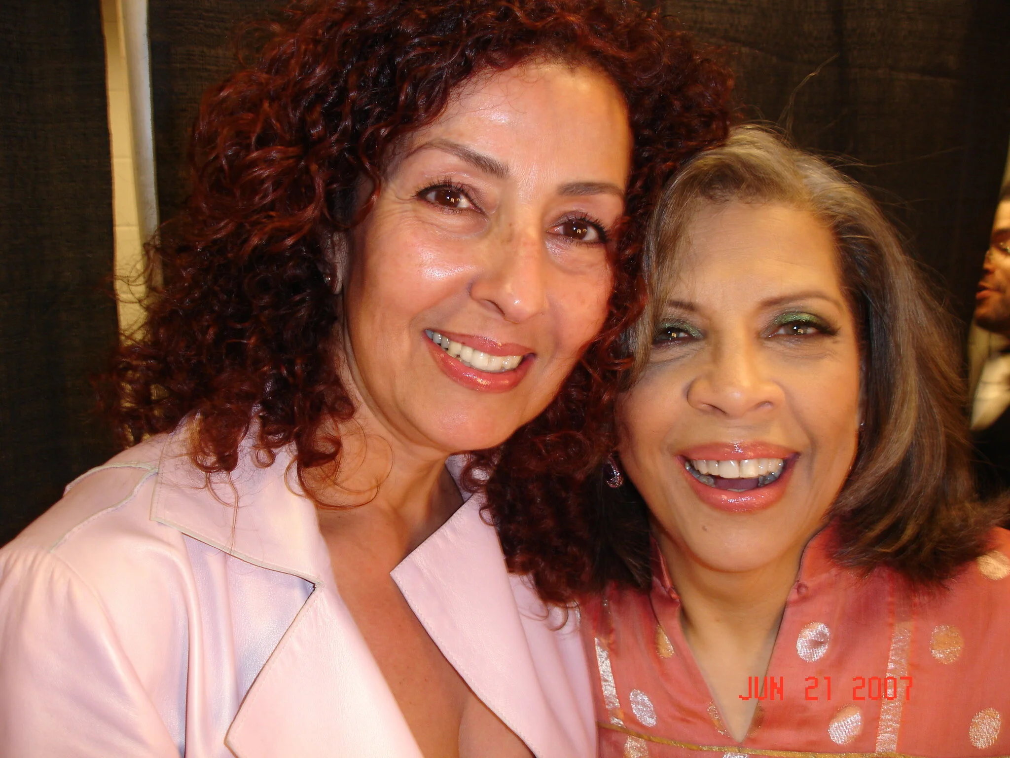 Two women smiling in close-up, one with curly red hair and the other with shoulder-length brown hair, at an event on June 21, 2007.